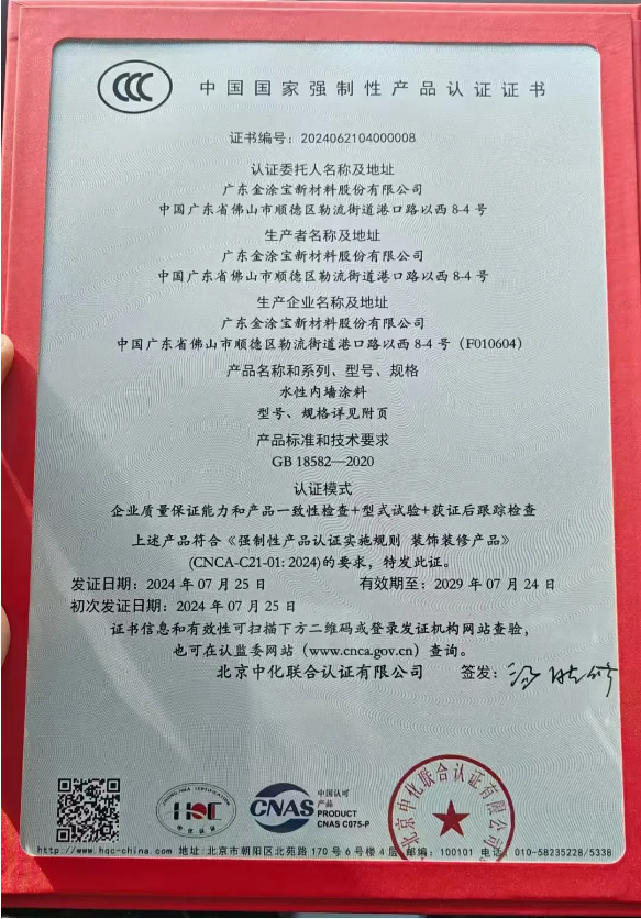 近日,經過中化聯的嚴格審核與評估,金塗(tú)寶(bǎo)-蜜桃视频(zhé)憑借其卓越的(de)產品品(pǐn)質和嚴格的生產管理通過水性內牆塗料國家強製性產品認證,成為首批通過(guò)國家CCC認證的塗料(liào)企業,標(biāo)誌著蜜桃视频漆在產品質量安全(quán)方麵達到了國家安全(quán)標準,再次獲得了權威機構的認可與肯定。