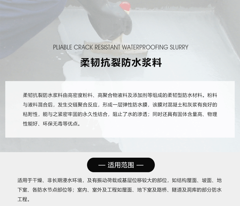 想要了解(jiě)更(gèng)多關於柔韌抗裂防水漿料歡迎谘詢(xún) 18022280326(微(wēi)信同號)
