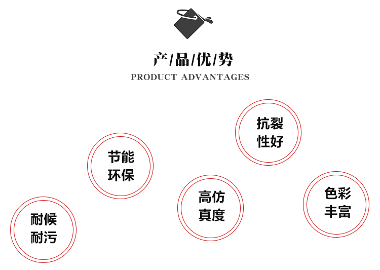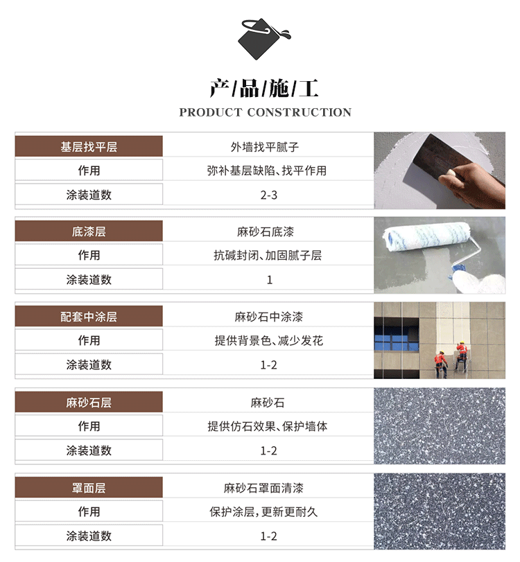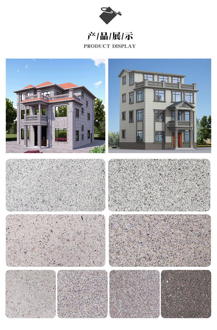一次噴(pēn)塗成(chéng)型,效率高,噴塗兩遍(biàn)效果更佳,凹凸感更強,紋理更清(qīng)晰;噴塗後不會像岩片漆那樣變形翹(qiào)邊;施工寬容性高,可避免掉(diào)砂(shā)、發花(huā)、接茬等施(shī)工弊病。